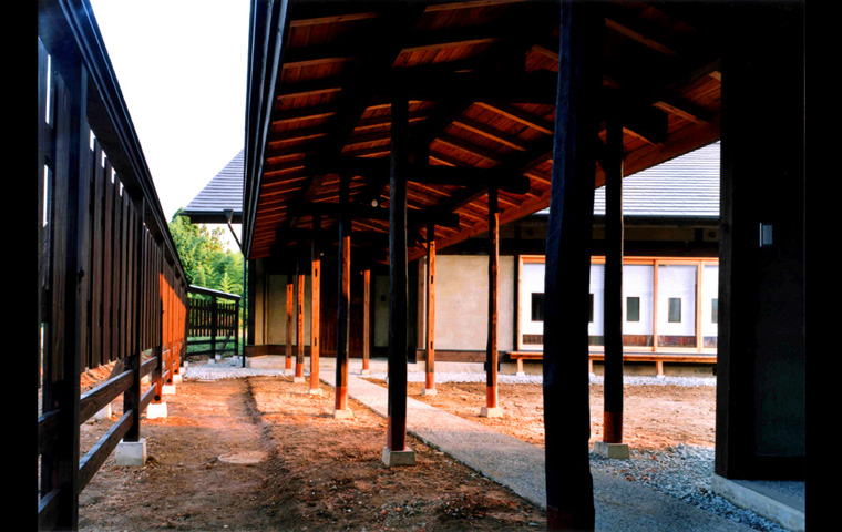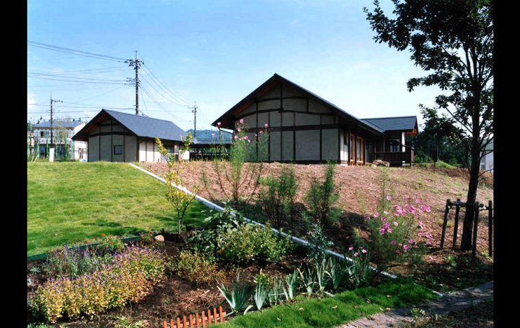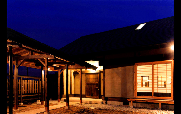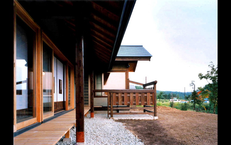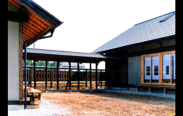 敷地は、南北に長いが、平均的な田の字プランの主屋部分は、敷地の「幅」の範囲に 東西方向、つまり主立った部屋を南向きで、 納めることが出来たため、北側の接道部分に、玄関棟と車庫を兼ねた別棟を配することが可能となった。そして主屋との間を渡り廊下で繋いだ。これにより、現代の住宅では、かねて見られなくなった、軒先の広い空間、用途を限定しない屋根下の外部空間を実現することができた。クライアントの趣味であるバイクの整備などもこの空間で楽しまれている。外部空間としては、「中庭」と「南庭」がある、プライバシーの守られた、この二つの庭を南北にもつ主屋は、いつも縁側をもつ大きな開口部を開放したままで生活することができる。