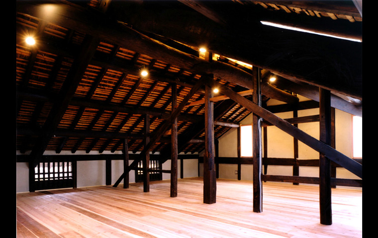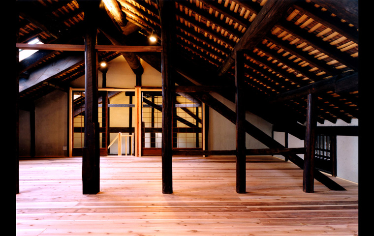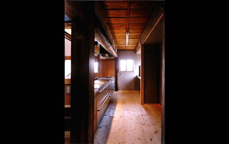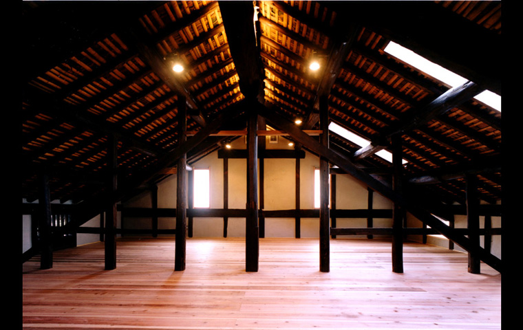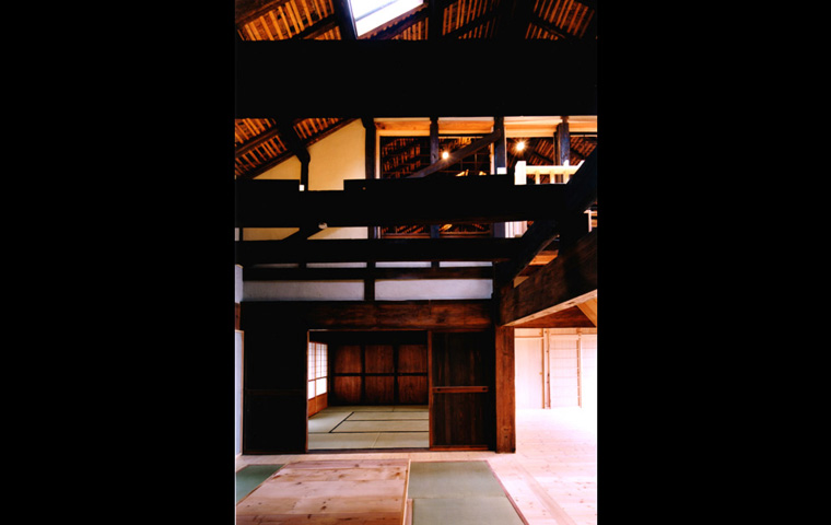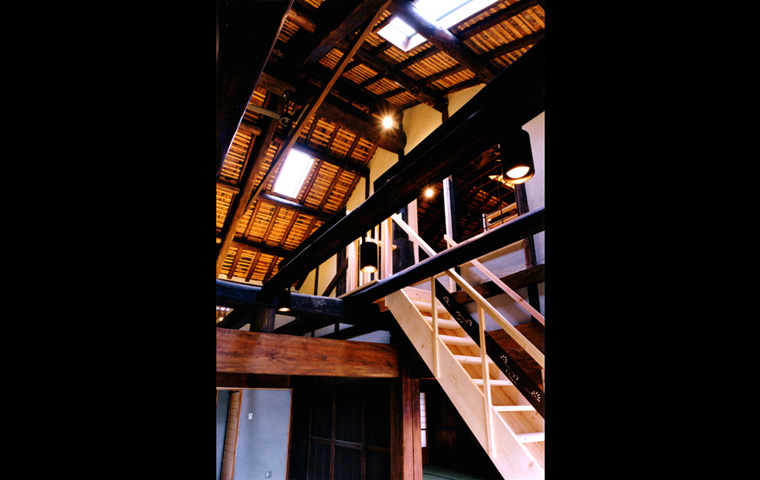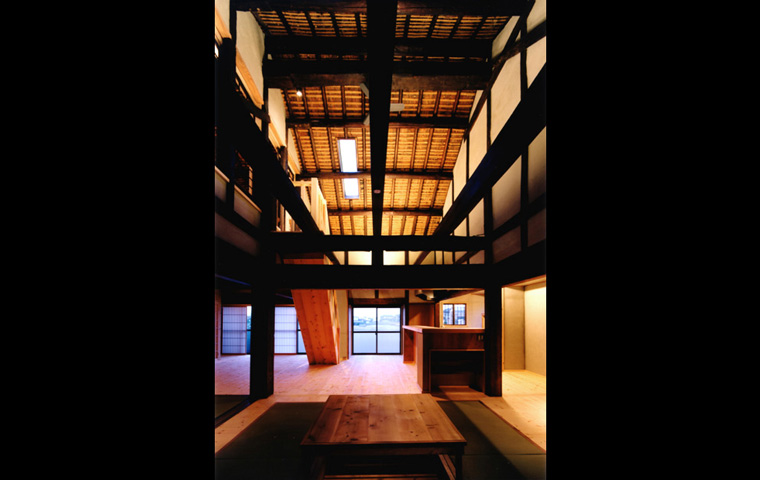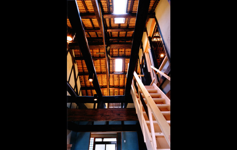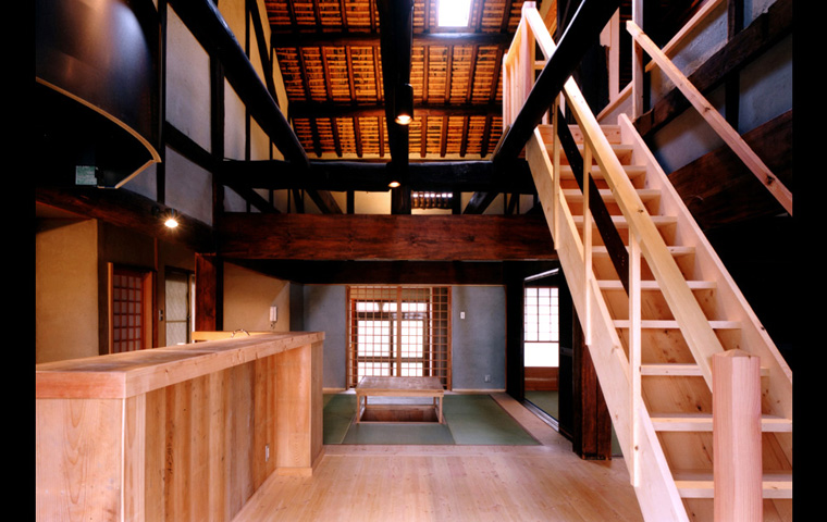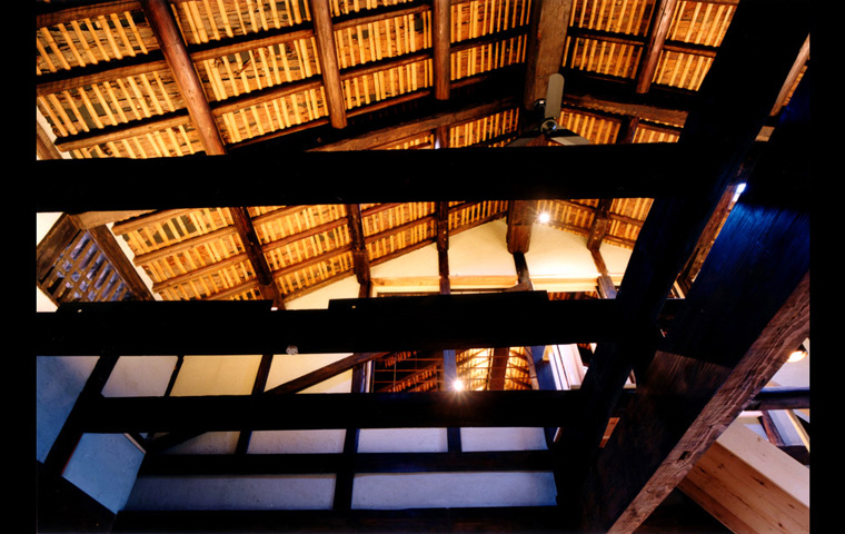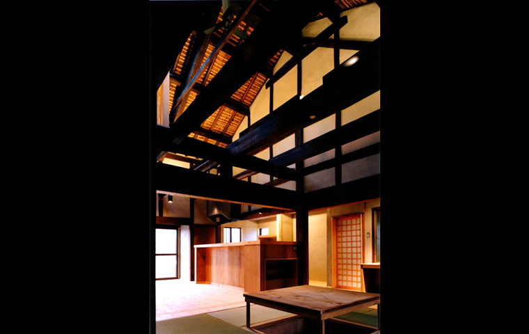 一口に、「100年の古民家」といっても、地域によって、構造、素材は様々で、林家では、その小屋組と屋根下地に大きな特徴があった。小屋組や洋小屋でも和小屋でもない、合掌に補強を加えた切り妻といったほうが当たっているような屋根構造だ。また屋根の下地は、割り竹を敷き、その上に杉皮を敷き、その上に直に壁土を厚塗りし、その上に和瓦をのせるといった造りであった。この屋根面内観は大変美しく、そのまま新しい空間の天井とした。竹と杉皮の色彩、素材感がよく、新たに設置した断熱材の性能と合わせて、この住居の大きな特徴となった。床面のレベルを揃え、ジャッキアップした状態で、主たる柱や床束の地面部分に鉄筋コンクリート現場打ちの独立基礎を設けた。底盤をささえる地盤は、粗い砂だ。かつての河口の海底だったことが分かる。この砂の地盤は、かなりしまっており、底盤を大きくする事で、不等沈下に対して、十分な安定性を確保できると考えた。(古民家スタイル8 原稿より引用)