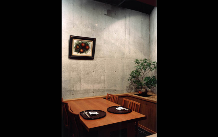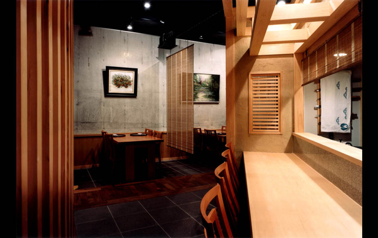 千駄ヶ谷に、その一年前に竣工した波多野ビルの地下のテナントである。施主は本格的な、和食割烹を目指す若いシェフで、食器なども修行時代を通じて、こつこつと自分で収集してきた筋金入り、本物の「料理人」である。テナントであるから、当然部屋のしつらえは「内装」になるが、シェフのもつ大変高い理想は見せかけの和の空間を許さない。本物の素材を使うことは勿論だが、それらの空間への活かし方が本物でなければならない。清潔さ、強さ、美しさ、新しさ、すべてが、提供されるサービスや料理のレベルとバランスがあっていなければならない。大変難しい仕事であった。