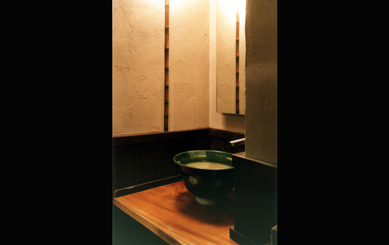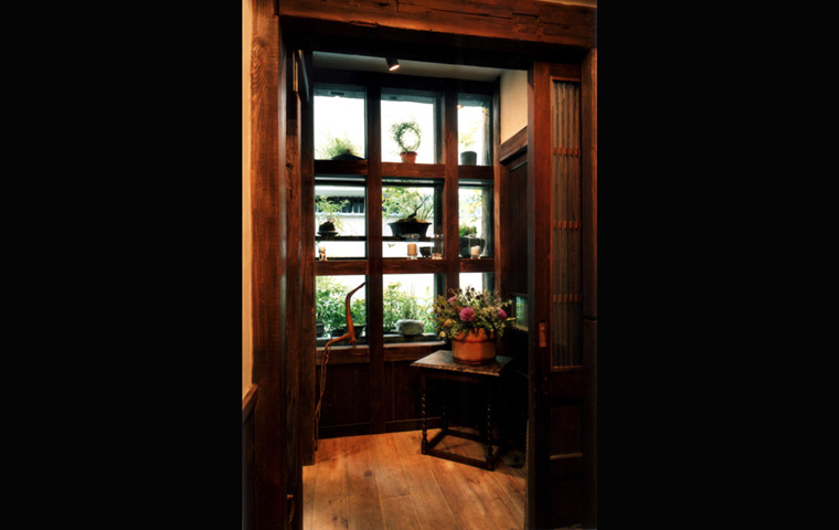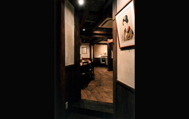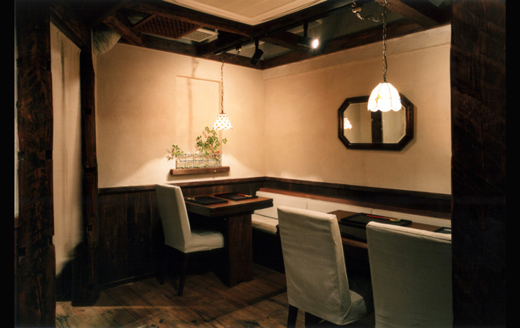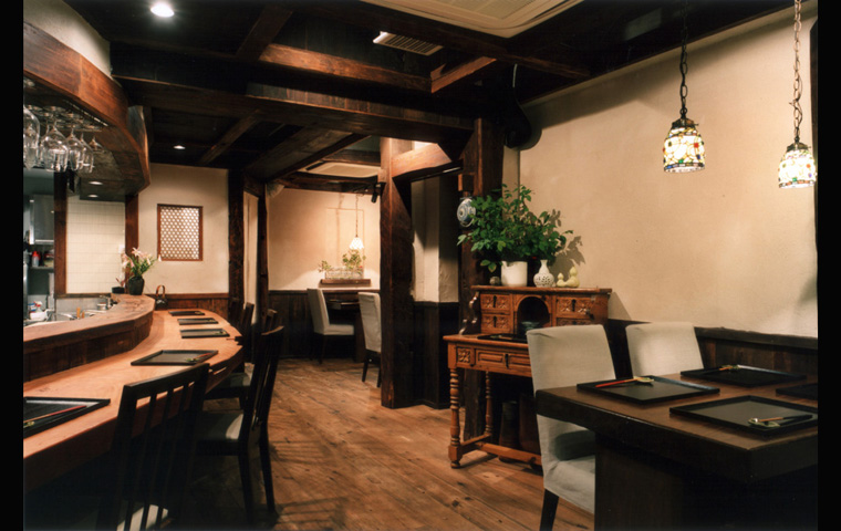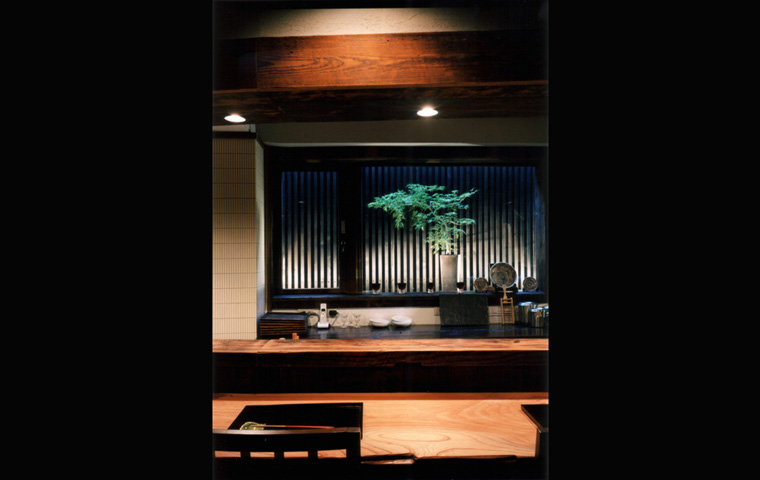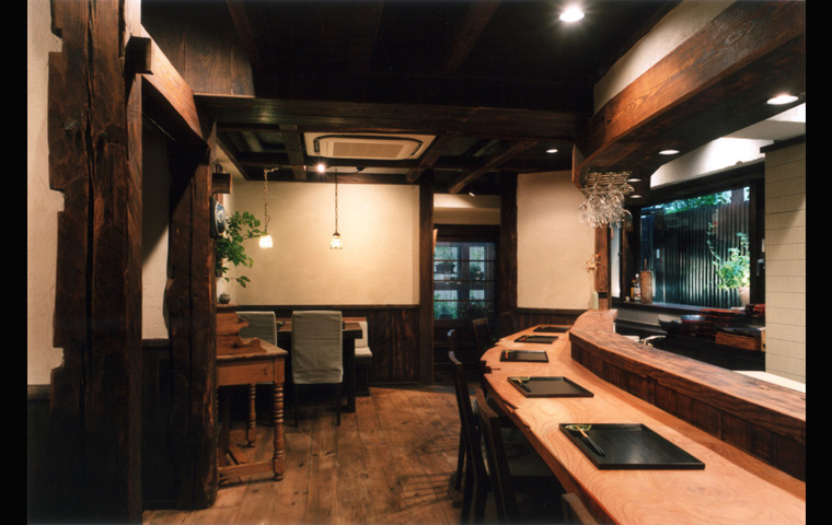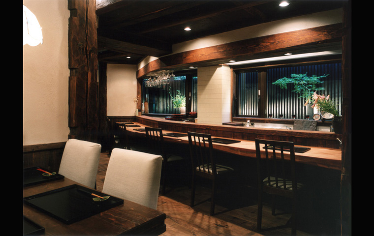 古材や塗り壁を主体とした空間創りで、新しい創作和食を楽しめる空間としている。カウンターを主とした客席構成となっている。シェフと客が対面し、シェフの料理を直に見ながら、また厨房の背後の大きな窓の外に展開された奥様の植栽空間を楽しみながらのディナーとなる。
