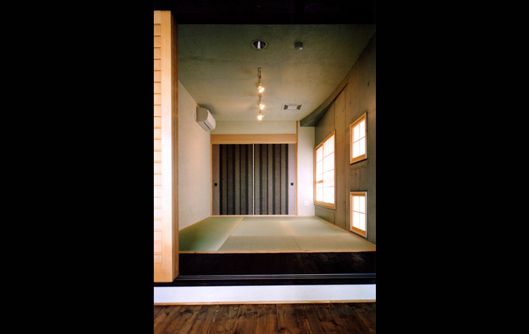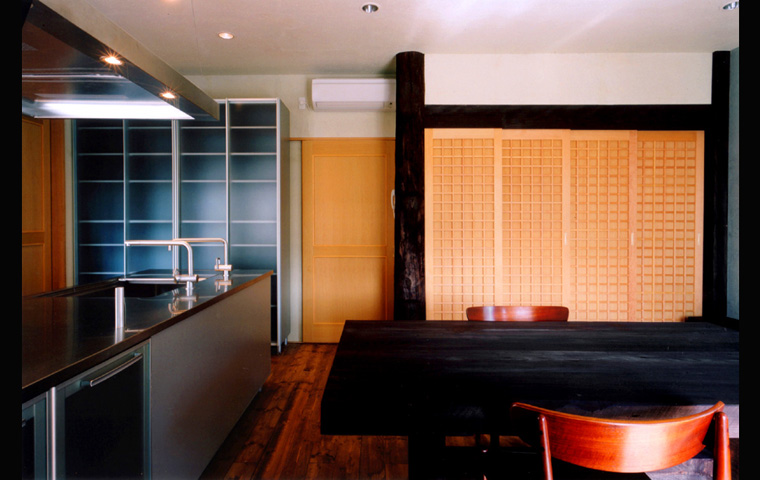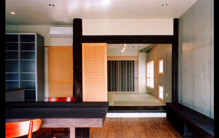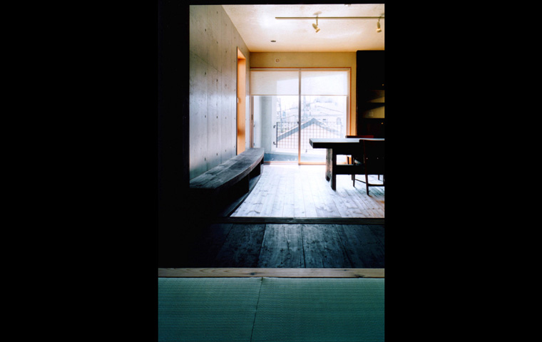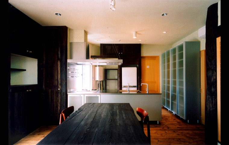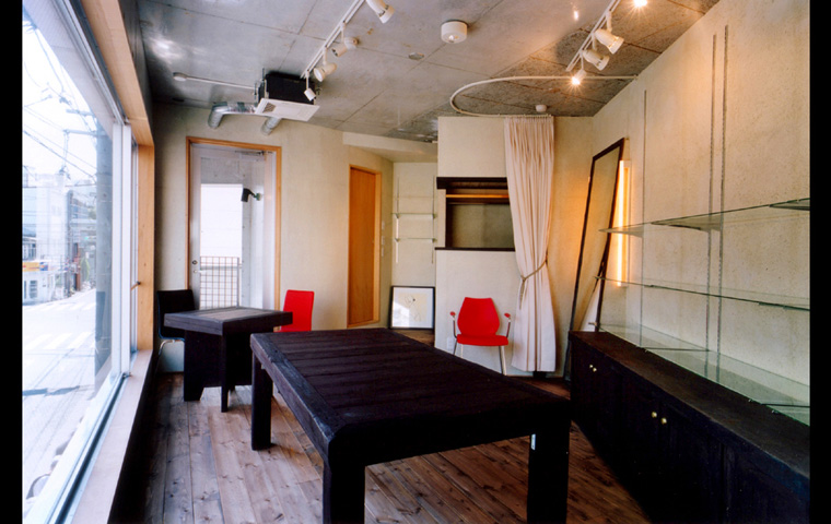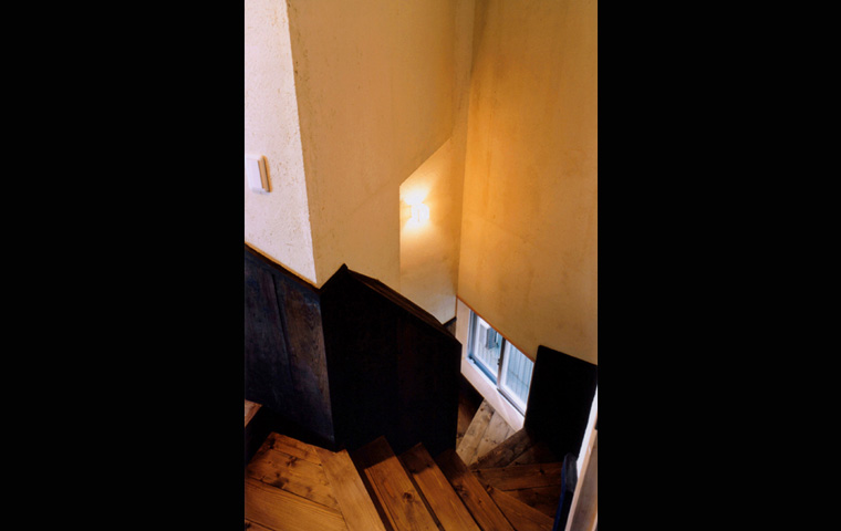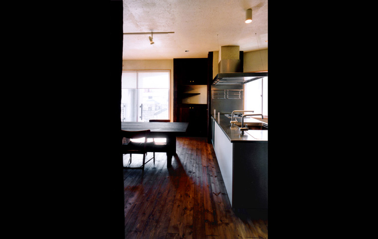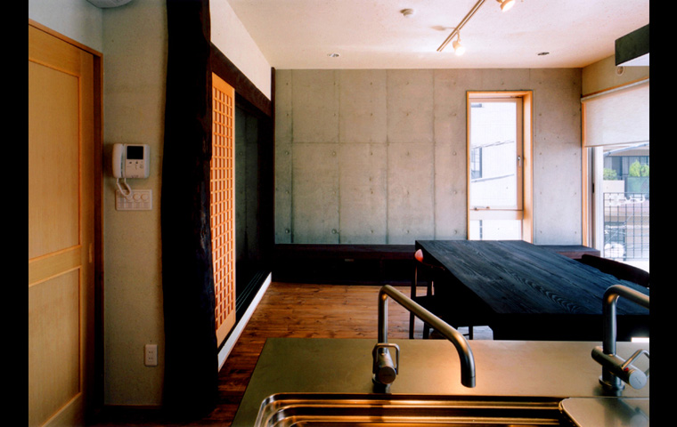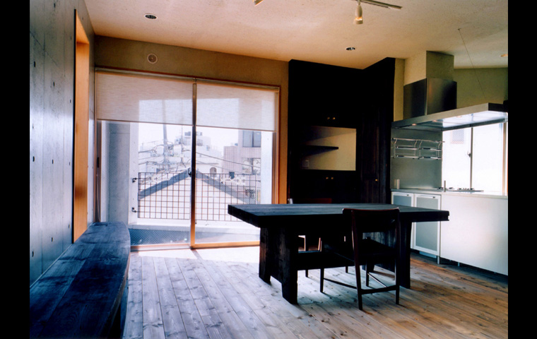 相続の段階から、相談を受け、店舗を前提とするならば、面積よりも間口を優先するようアドバイスした。鉄筋コンクリート打ち放しと塗り壁、古材の板を仕上げ材の主たるものとした、和の建物である。広くはないフロアを、狭さを感じさせないようにするには、空間を相互に共有させるとよい。キッチンから食堂、和室、さらには外部の空間まで、常に視線の先に奥行きの深い空間を配置することによって、豊かな生活空間を創出することができた。収納は、適切な所に適切なボリュームを設けると、生活上の小物で、空間が溢れる事は少なくなる。三角形という敷地形状は、そのままビル全体の平面形となるが、そこに多くの収納空間を確保できる必然性が生じる。