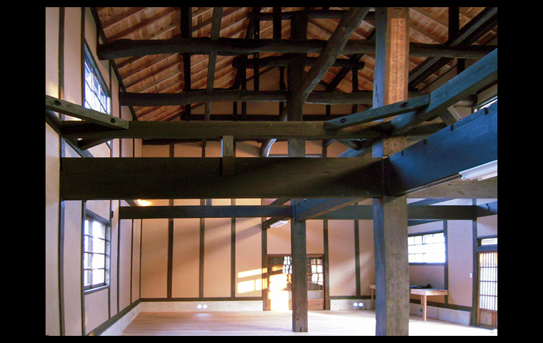 群馬の典型的な大型養蚕農家であるが、比較的階高があり、2階建て+ロフト付きで約10Mの高さがある。建物として大切な構造部分は、徹底的にやり直した。本体は一旦すべて解体して、基礎を本格的な鉄筋コンクリート基礎とし、多くの柱材などは、一部の新材を含め、将来の構造耐力面を考慮して、入れ替えた。