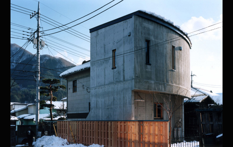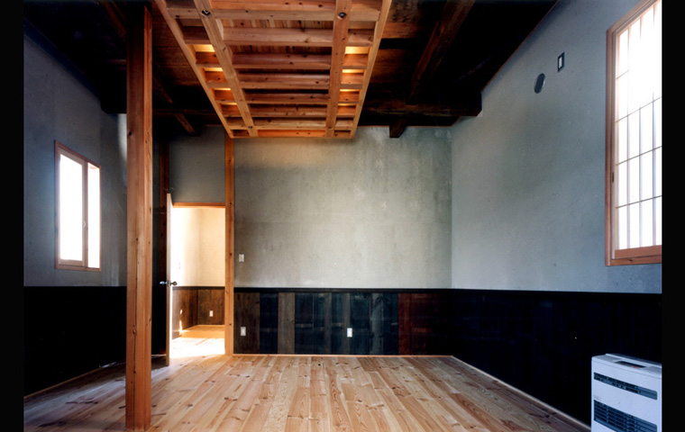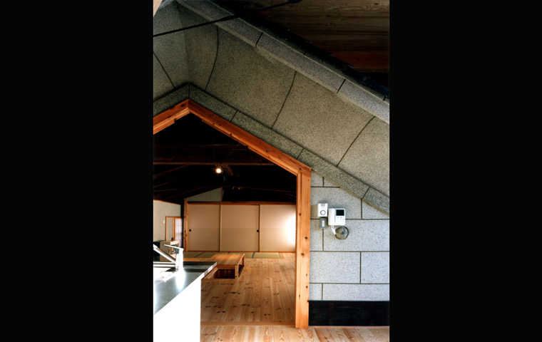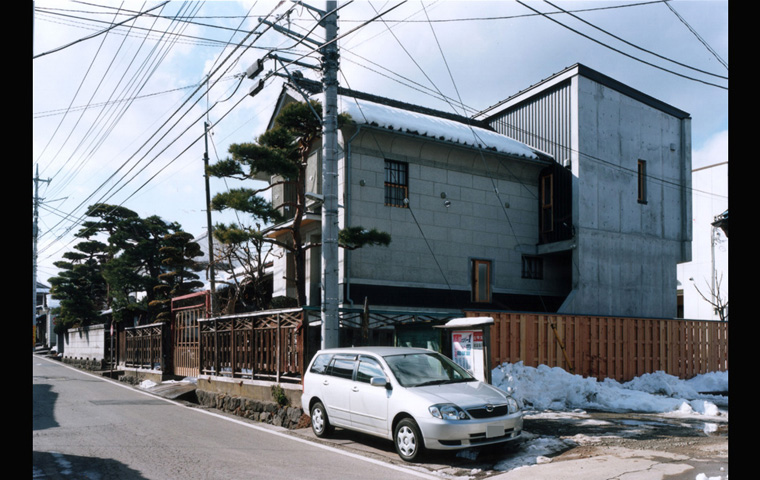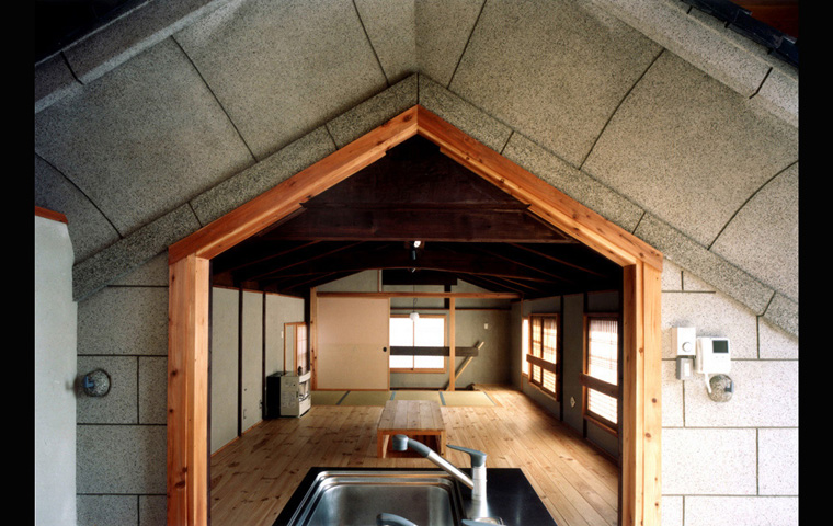 築90年の蔵の現地再生を中心とした住宅の増改築。場所は、山梨県の大月から山中湖に抜ける街道沿いの旧農家。施主が、子供時代に勉強部屋として使っていたのが、この蔵(座敷蔵)の2階の和室だった。この蔵を改造して、夫婦2人のための快適な住宅とするのが目的。この地からは、富士山が間近だが、今の建物の配置や、蔵の高さでは、窓から富士山を臨む事ができなかった。事前の測定の結果、蔵の二階をあと1500mm高く持ち上げれば、富士山をいつも眺める事ができることも分かり、基礎、土台の改修をかねて、全体のリフトアップを敢行した。鉄筋コンクリートの基礎を鉄筋コンクリート打ち放しの増築部分と一体化し、さらに、懐かしい蔵のファサードをそのまま室内に持ち込んで、かつての子供時代の環境を継続して引き継ぐ方法とした。