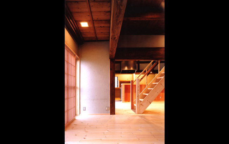 一口に、「100年の古民家」といっても、地域によって、構造、素材は様々で、林家では、その小屋組と屋根下地に大きな特徴があった。小屋組や洋小屋でも和小屋でもない、合掌に補強を加えた切り妻といったほうが当たっているような屋根構造だ。また屋根の下地は、割り竹を敷き、その上に杉皮を敷き、その上に直に壁土を厚塗りし、その上に和瓦をのせるといった造りであった。この屋根面内観は大変美しく、そのまま新しい空間の天井とした。竹と杉皮の色彩、素材感がよく、新たに設置した断熱材の性能と合わせて、この住居の大きな特徴となった。床面のレベルを揃え、ジャッキアップした状態で、主たる柱や床束の地面部分に鉄筋コンクリート現場打ちの独立基礎を設けた。底盤をささえる地盤は、粗い砂だ。かつての河口の海底だったことが分かる。この砂の地盤は、かなりしまっており、底盤を大きくする事で、不等沈下に対して、十分な安定性を確保できると考えた。(古民家スタイル8 原稿より引用)