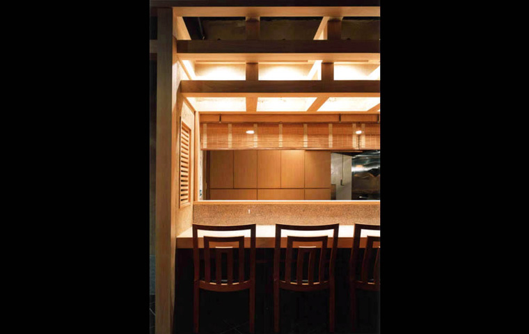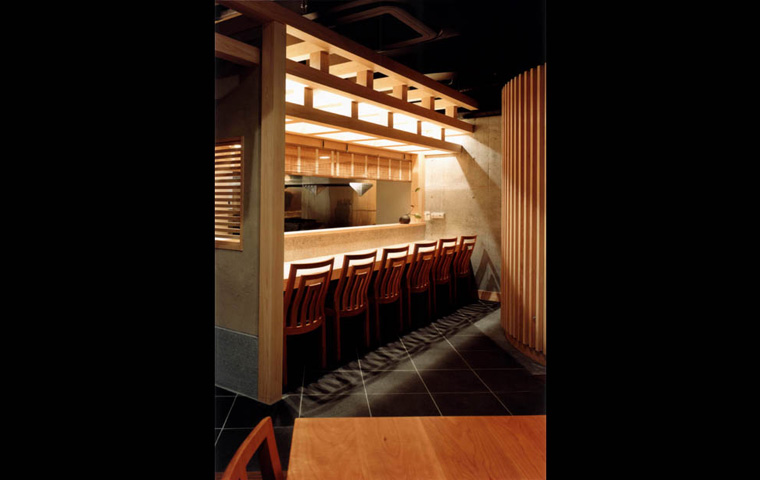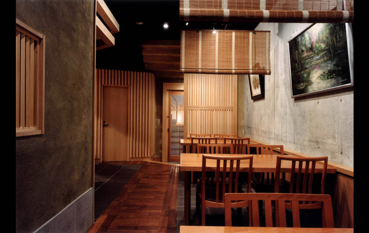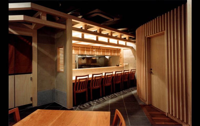 千駄ヶ谷に、その一年前に竣工した波多野ビルの地下のテナントである。施主は本格的な、和食割烹を目指す若いシェフで、食器なども修行時代を通じて、こつこつと自分で収集してきた筋金入り、本物の「料理人」である。テナントであるから、当然部屋のしつらえは「内装」になるが、シェフのもつ大変高い理想は見せかけの和の空間を許さない。本物の素材を使うことは勿論だが、それらの空間への活かし方が本物でなければならない。清潔さ、強さ、美しさ、新しさ、すべてが、提供されるサービスや料理のレベルとバランスがあっていなければならない。大変難しい仕事であった。